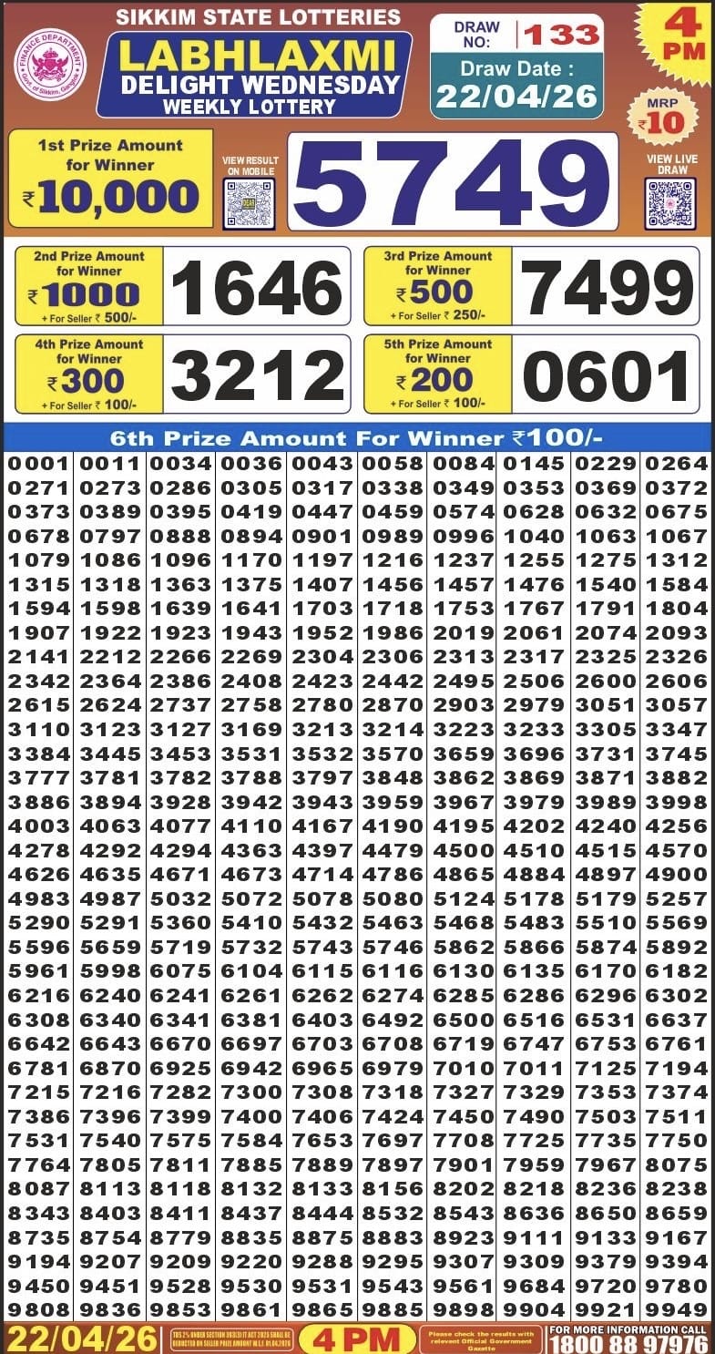 Sikkim State Labhlaxmi Delight Wednesday Weekly Lottery 22.04.2026 Result 4 PM