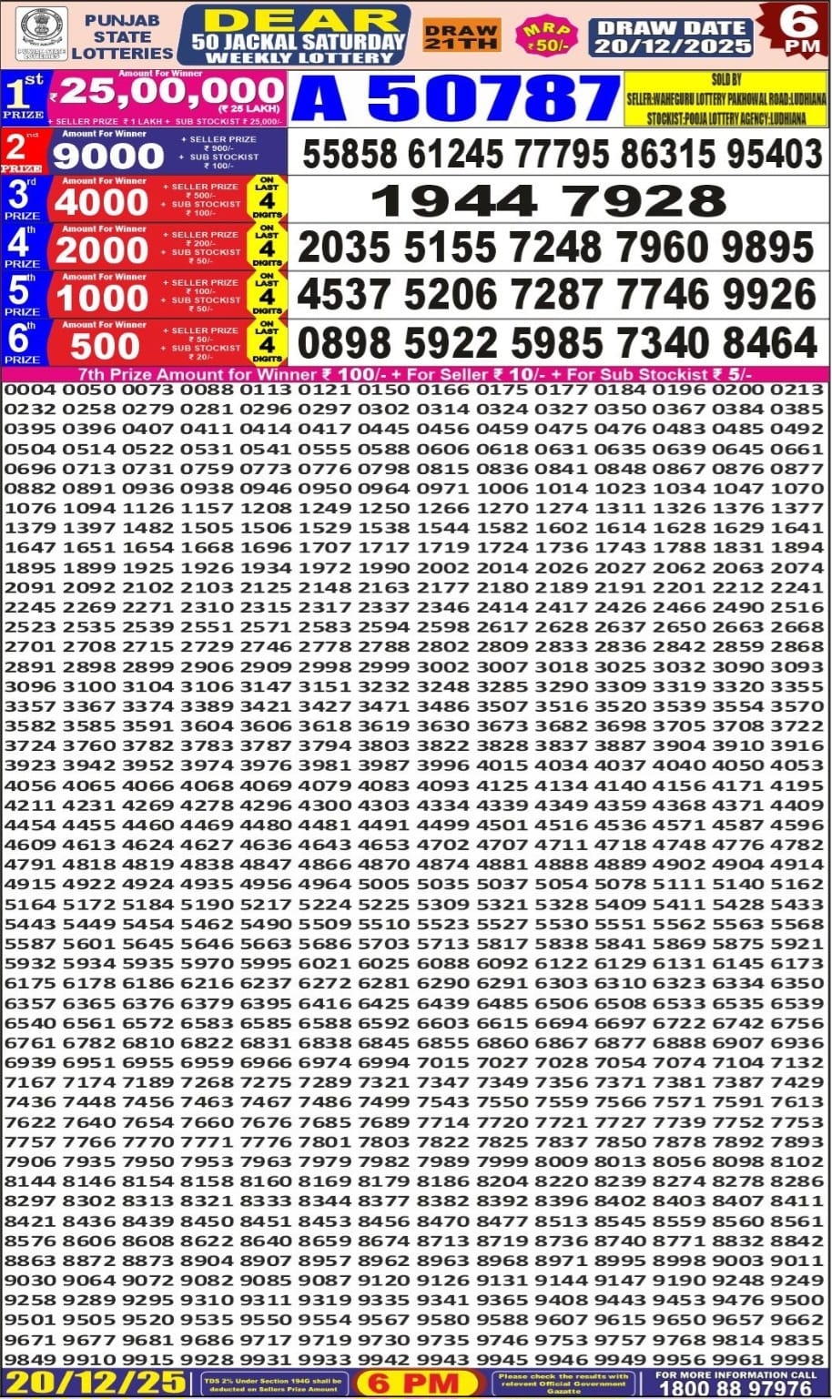 Punjab State Dear 50 Jackal Saturday 6pm Lottery Result 20.12.2025