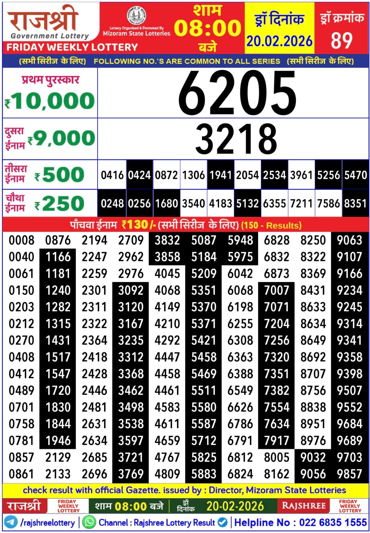 Rajshree Friday Weekly Lottery 20.2.2026 Result 8 PM