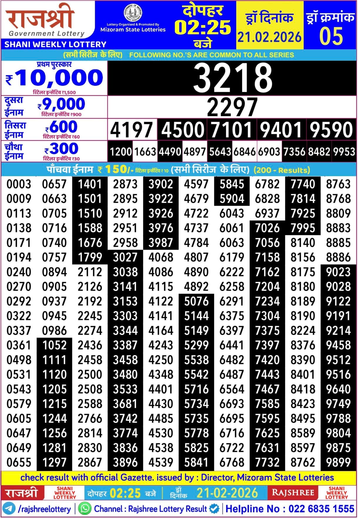 Rajshree Shani Weekly Lottery 21.2.2026 Result 2.25 PM