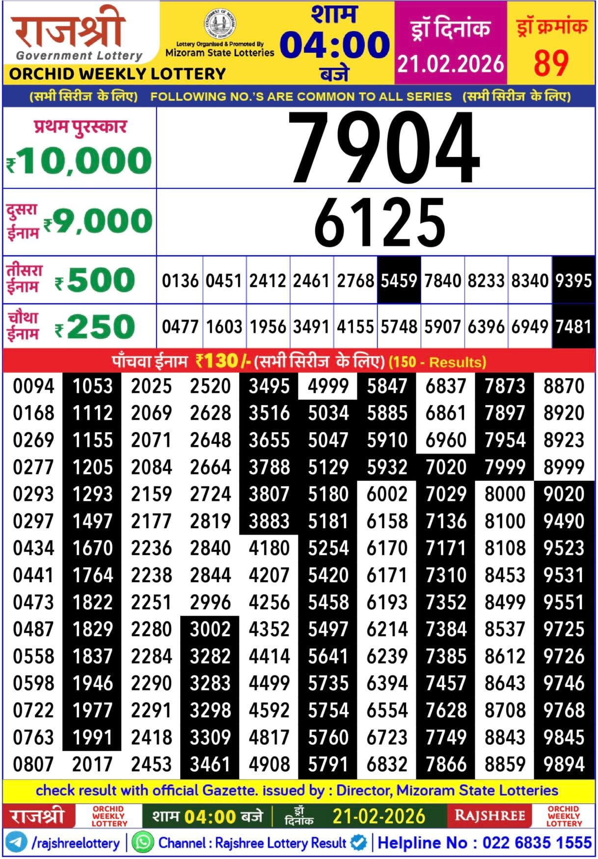 Rajshree Orchid Weekly Lottery 21.2.2026 Result 4 PM