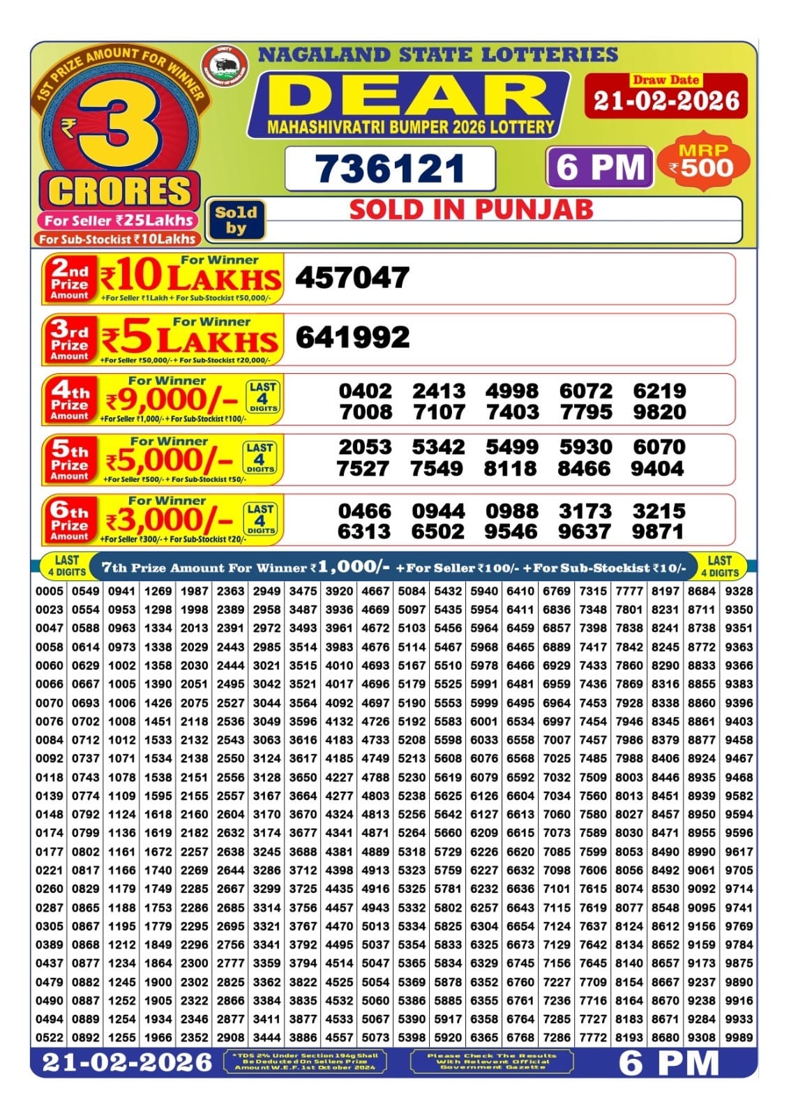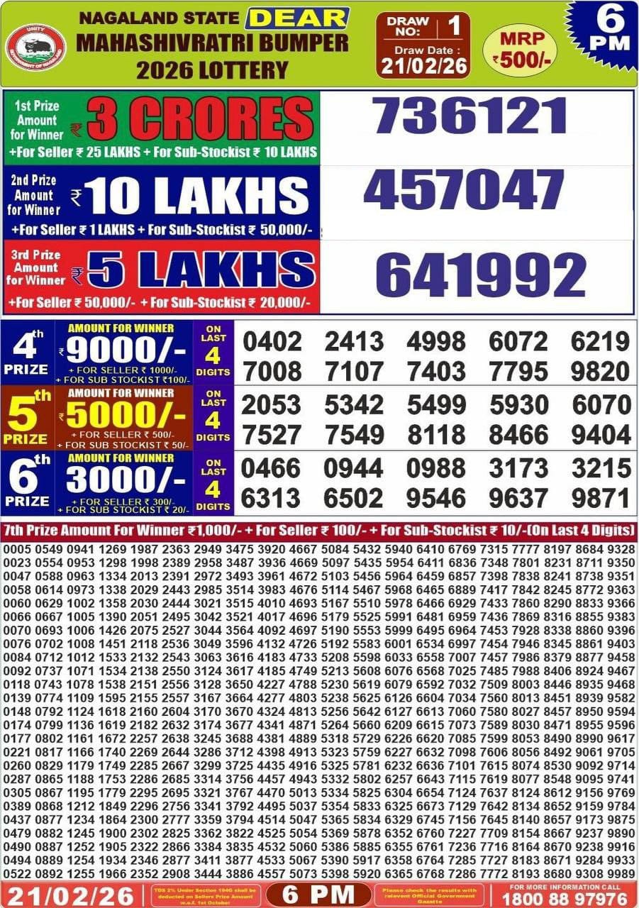 Nagaland State Dear Mahashivratri Bumper Lottery 21 Febraury 2026 At 6 PM