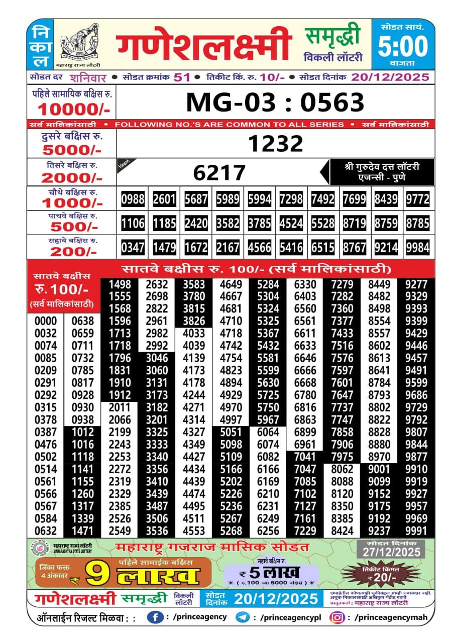 Maharashtra Ganeshlaxmi Samruddhi Weekly Draw 20.12.2025 Result 5pm