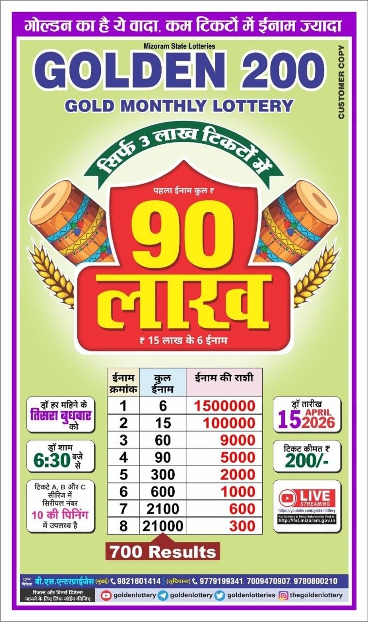 Golden 200 Gold Monthly Lottery 15 April 2026 At 6.30 PM