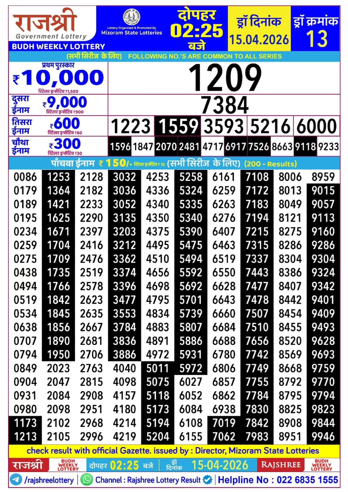 Rajshree Budh Weekly Lottery 15.04.2026 Result 2.25 PM