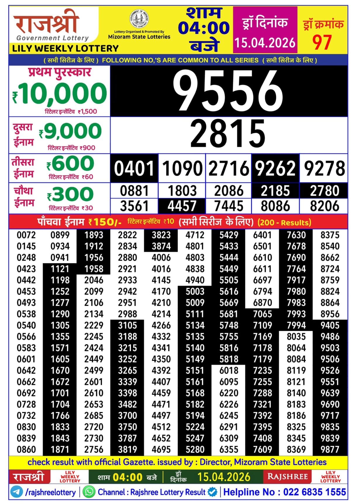 Rajshree Lily Weekly Lottery 15.04.2026 Result 4 PM