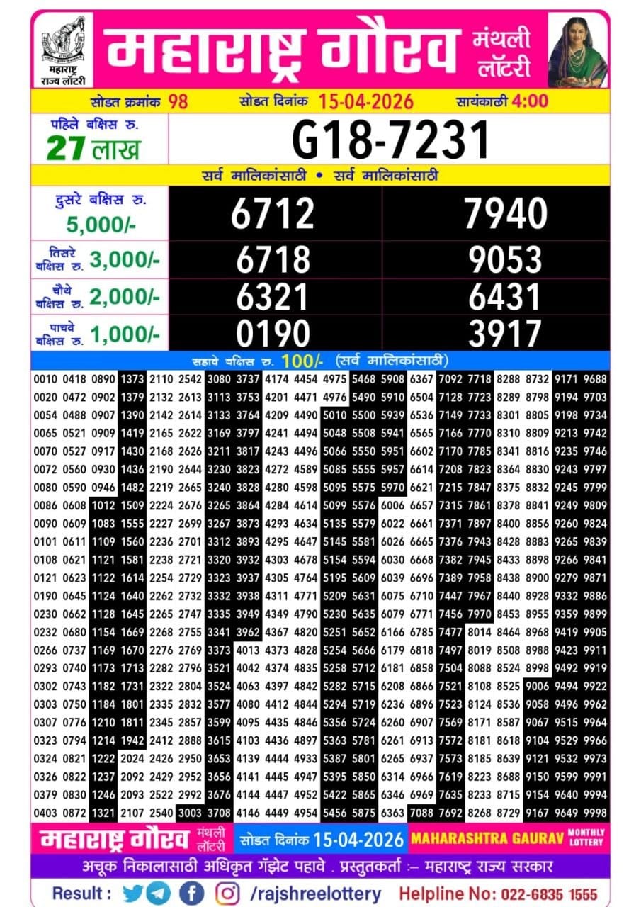 Maharashtra Gaurav Monthly Lottery Draw 15.04.2026 Result 4 PM