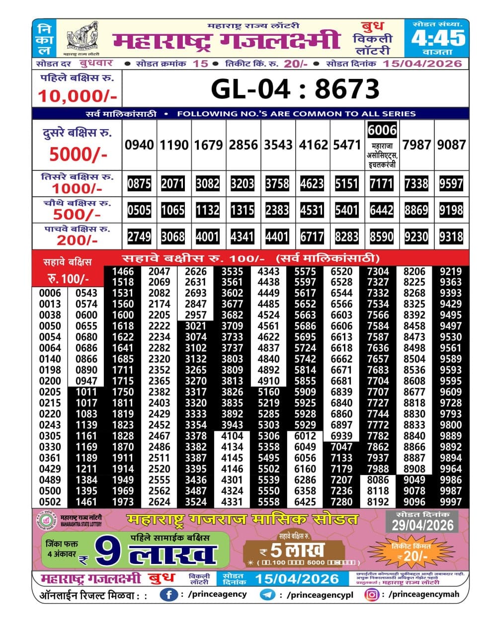 Maharashtra Gajlaxmi Budh Weekly Draw 15.04.2026 Result 4.45 PM