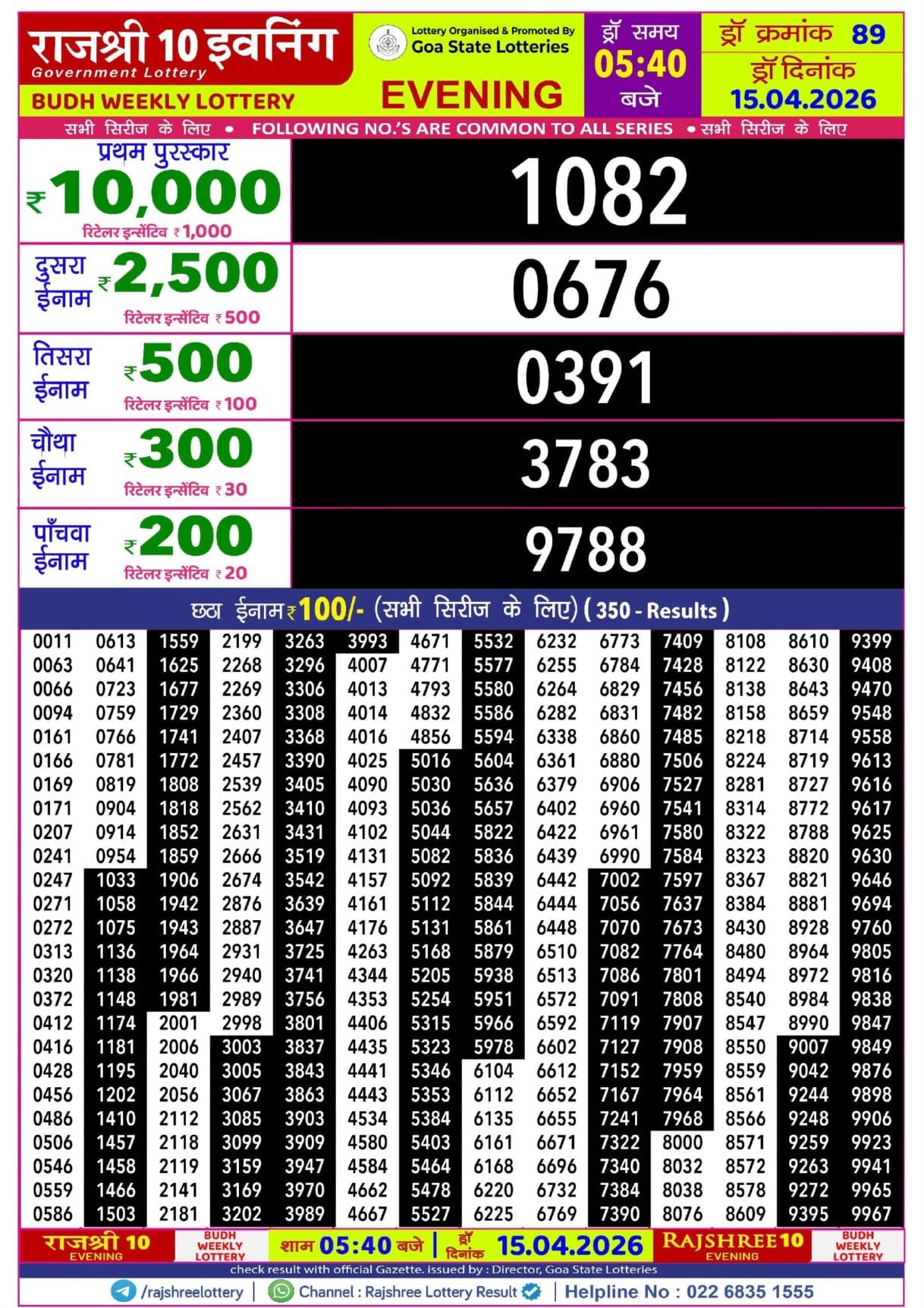 Goa State Rajshree 200 Monthly Lottery (Baisakhi Special) 16.04.2026 Result 6.30 PM