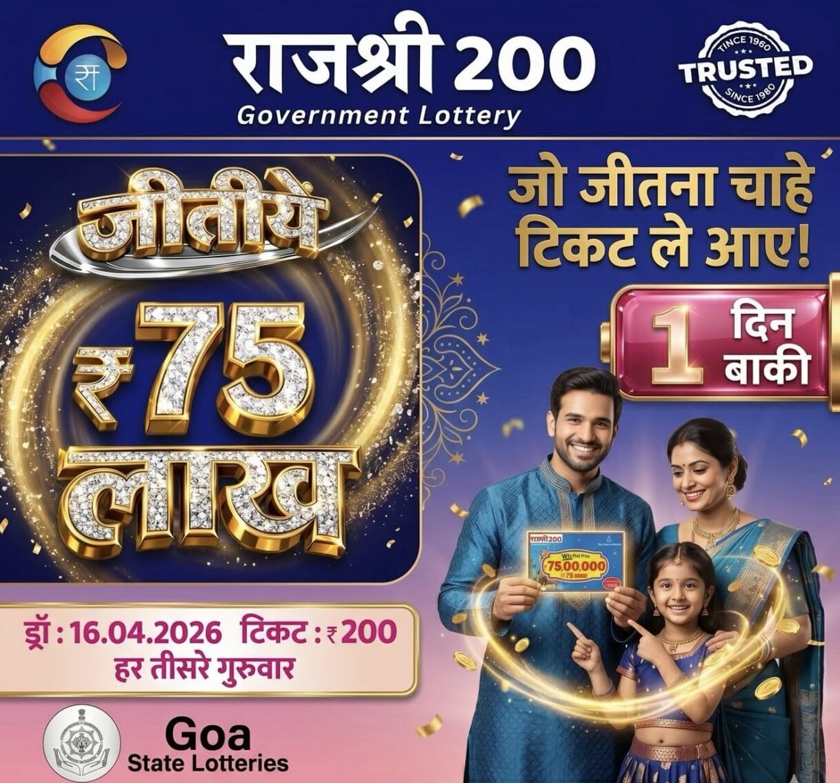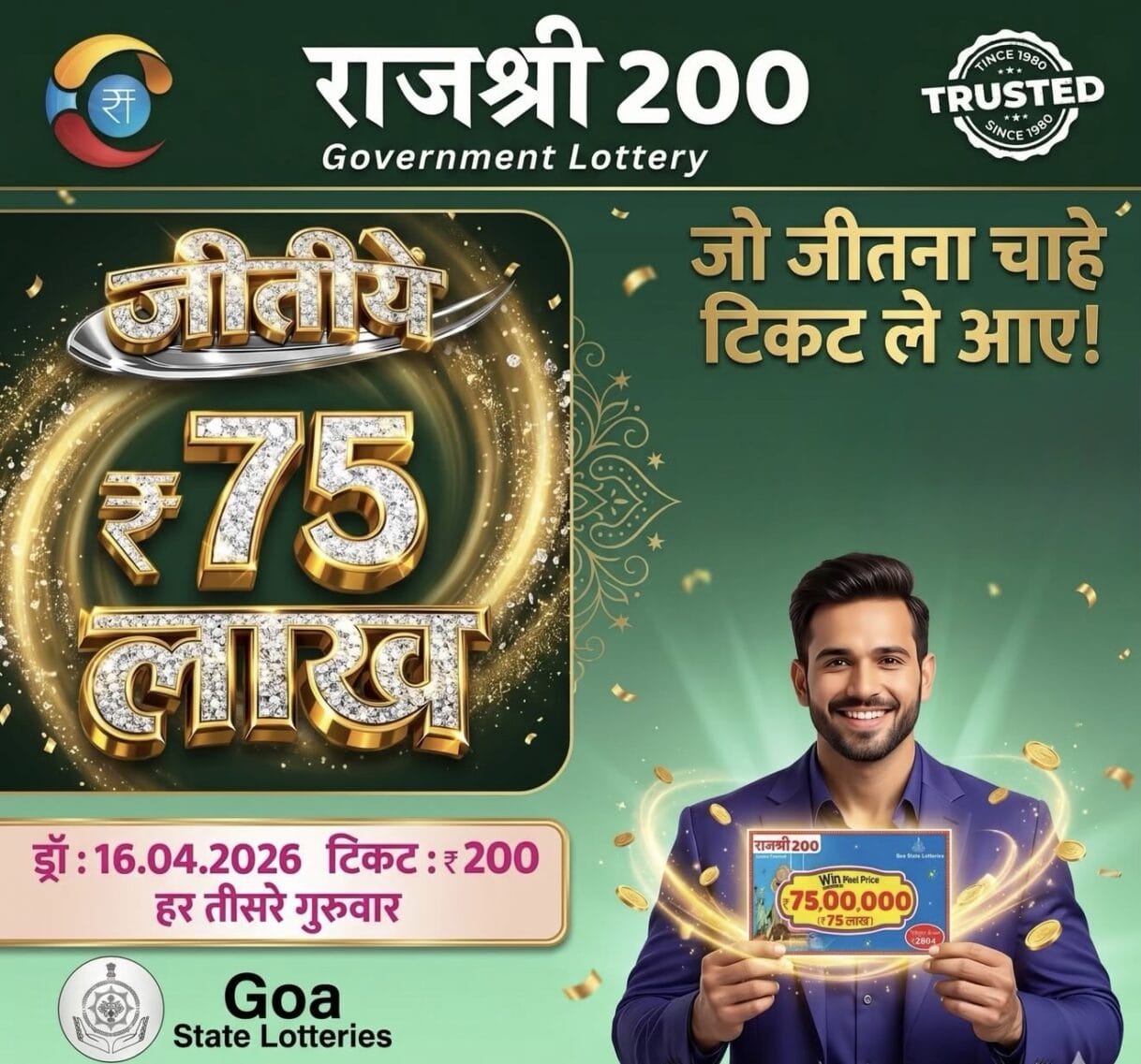 Goa State Rajshree 200 Monthly Lottery 16 April 2026 At 6.30 PM (Baisakhi Special)