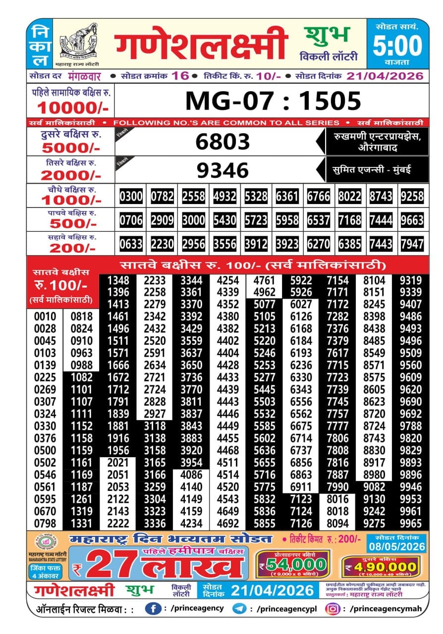 Maharashtra Ganeshlaxmi Shubh Weekly Draw 21.04.2026 Result 5 PM