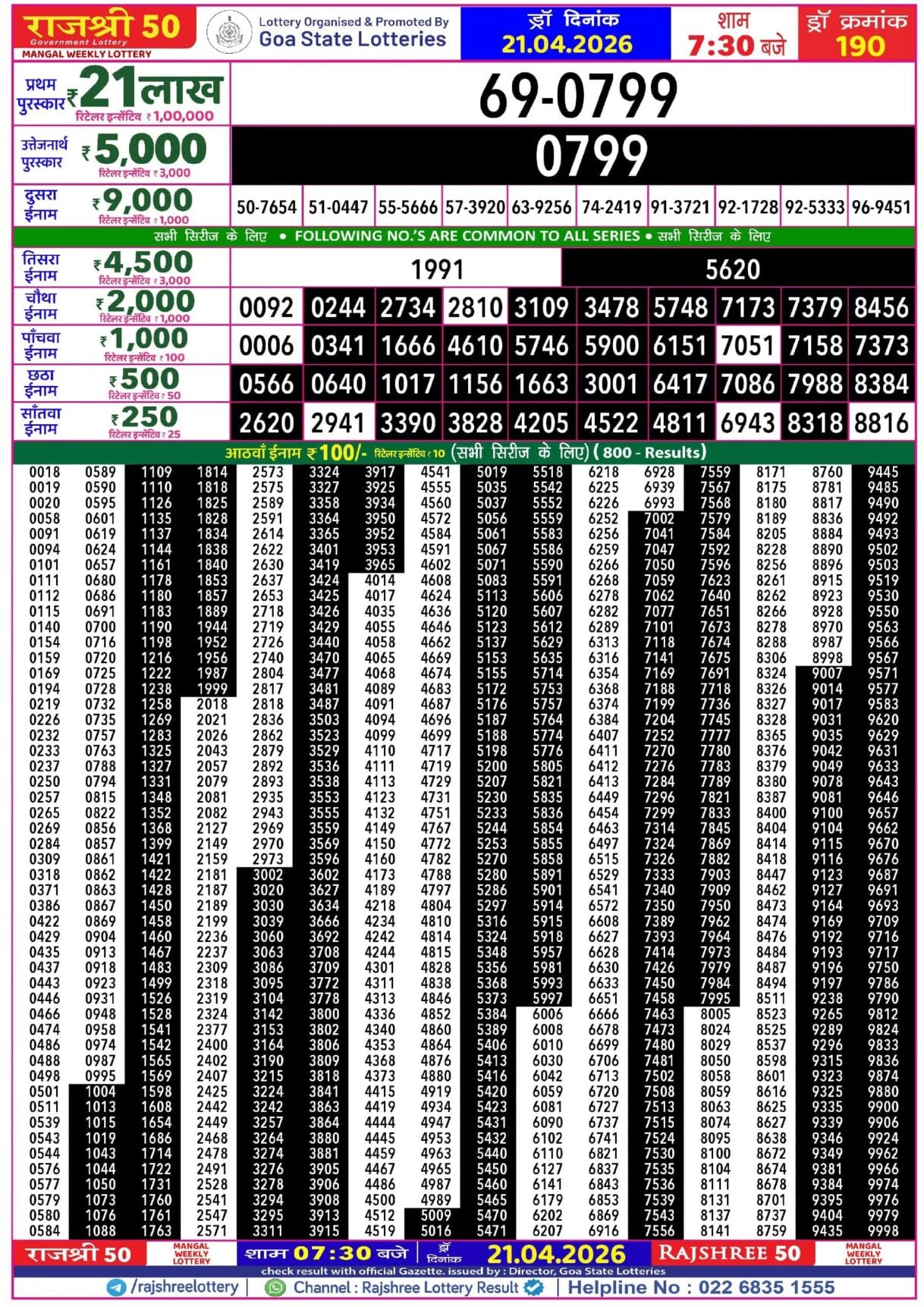 Rajshree 50 Mangal Weekly Lottery 21.04.2026 Result 7.30 PM
