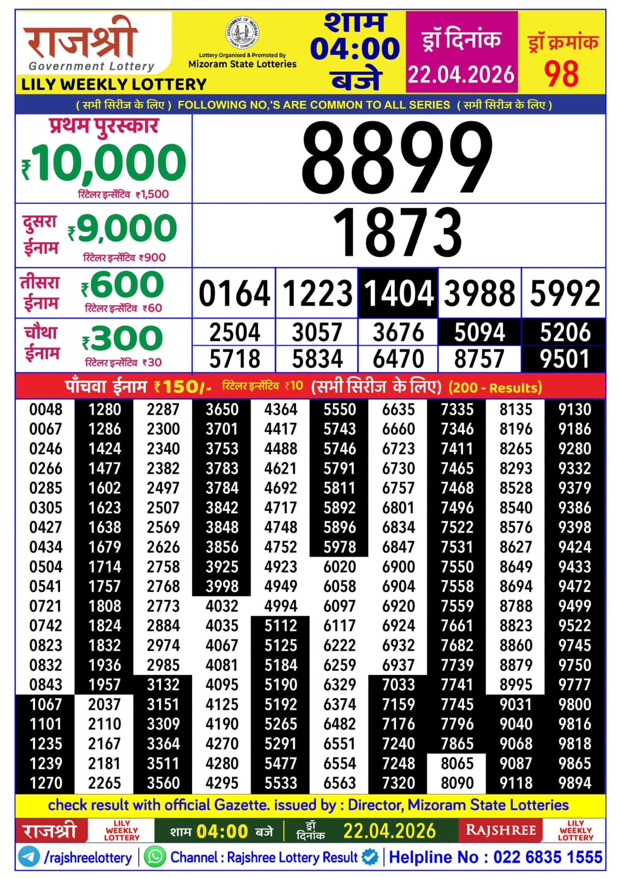Rajshree Lily Weekly Lottery 22.04.2026 Result 4 PM