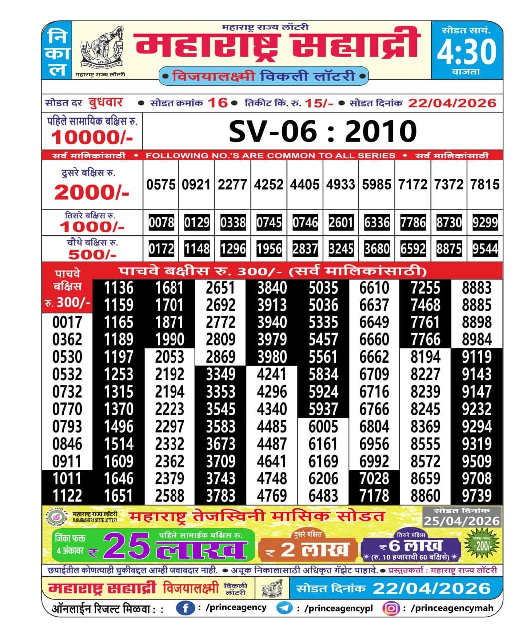 Maharashtra Sahyadri Vijayalaxmi Weekly Draw 22.04.2026 Result 4.30 PM