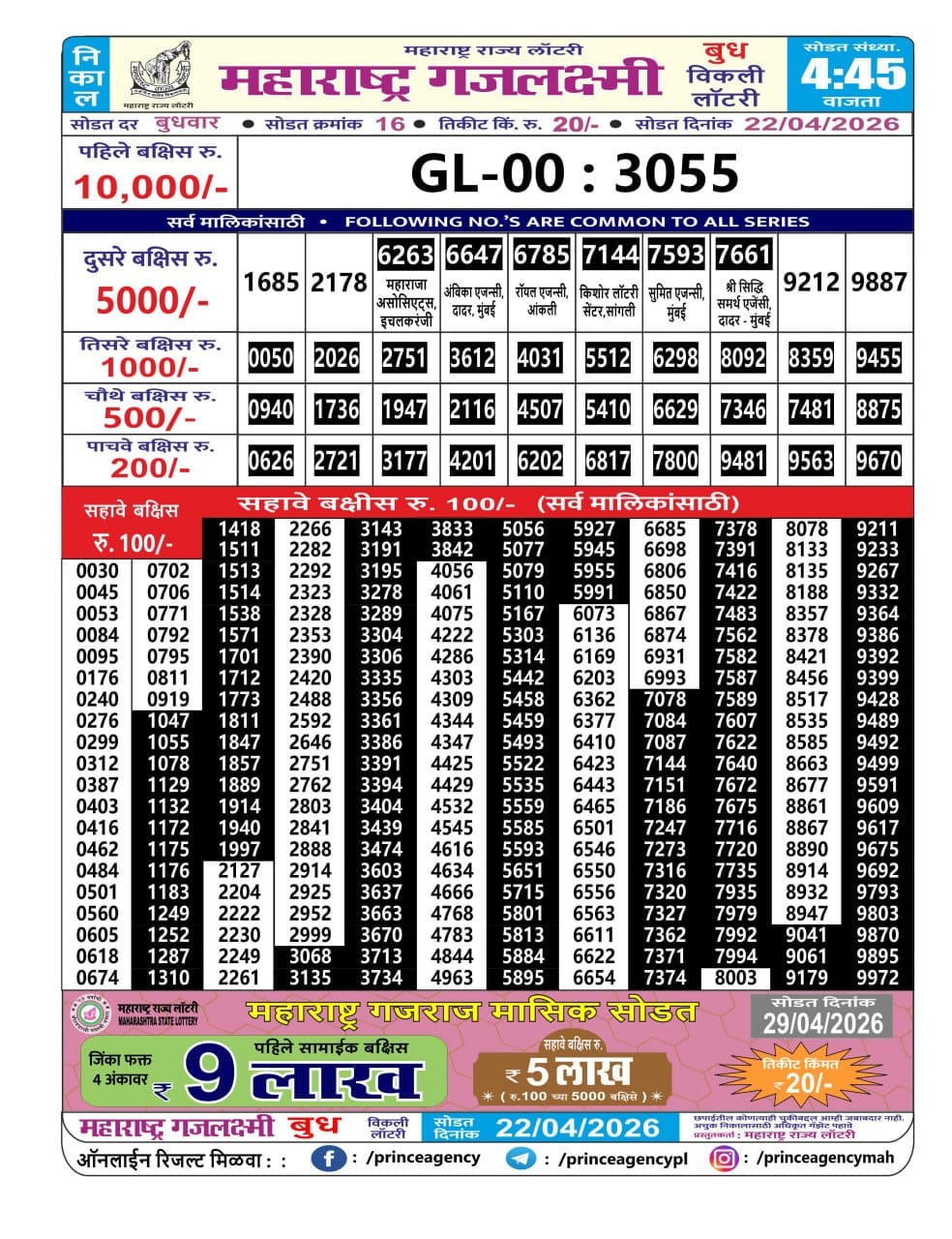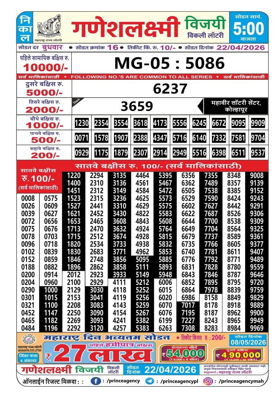Maharashtra Gajlaxmi Budh Weekly Draw 22.04.2026 Result 4.45 PM