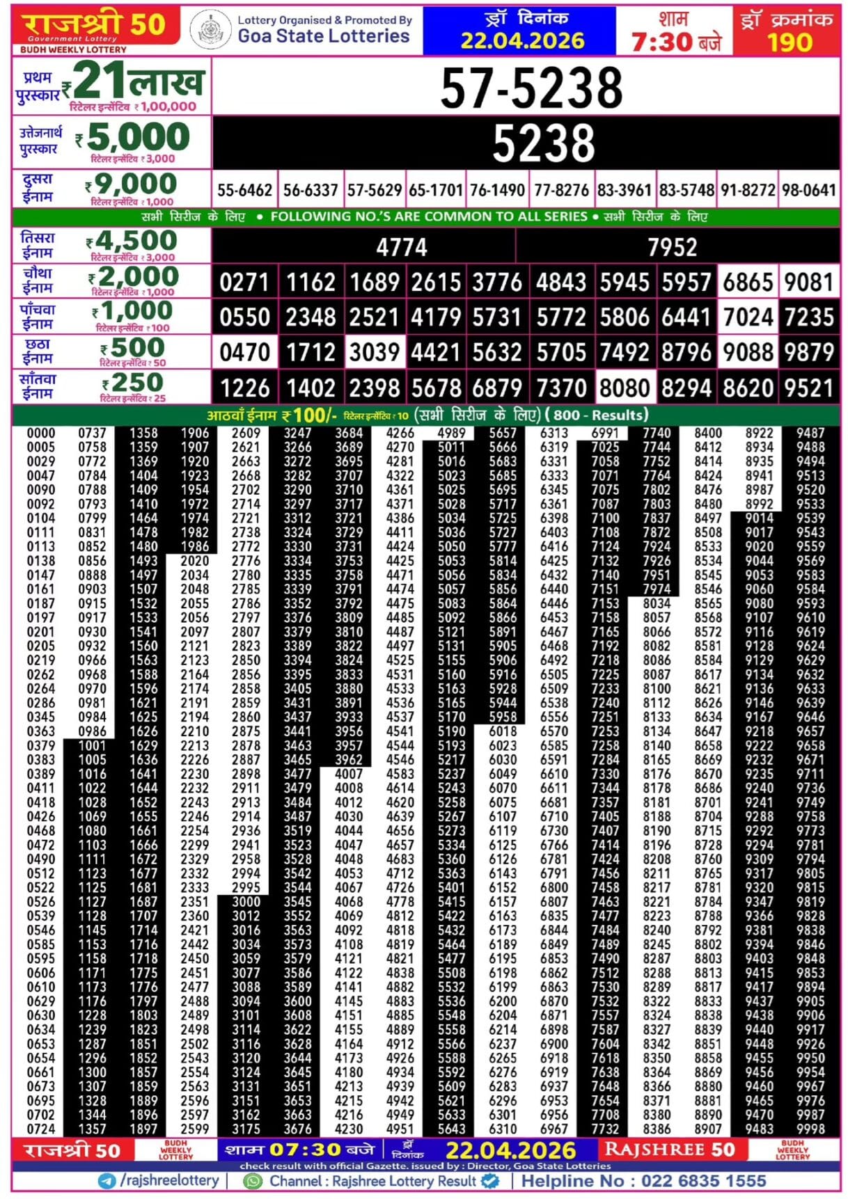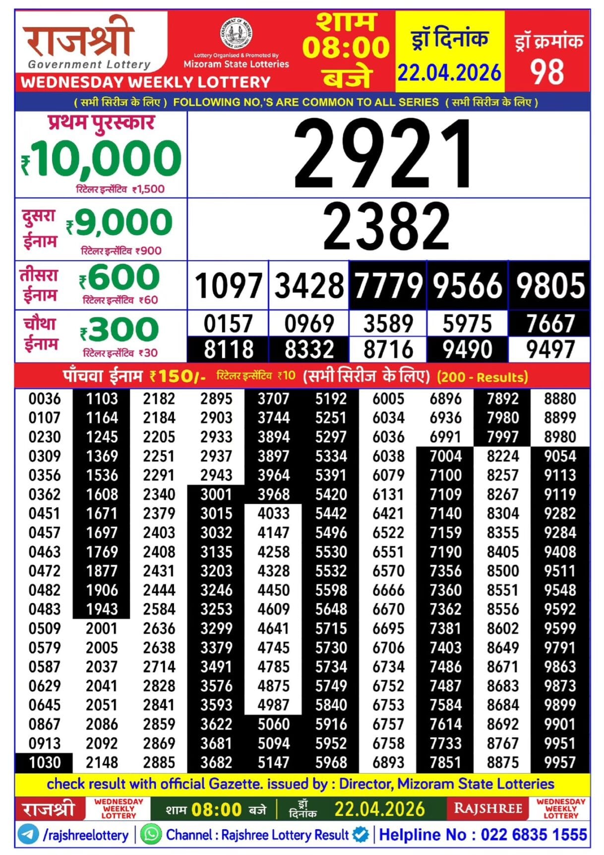 Rajshree Wednesday Weekly Lottery 22.04.2026 Result 8 PM