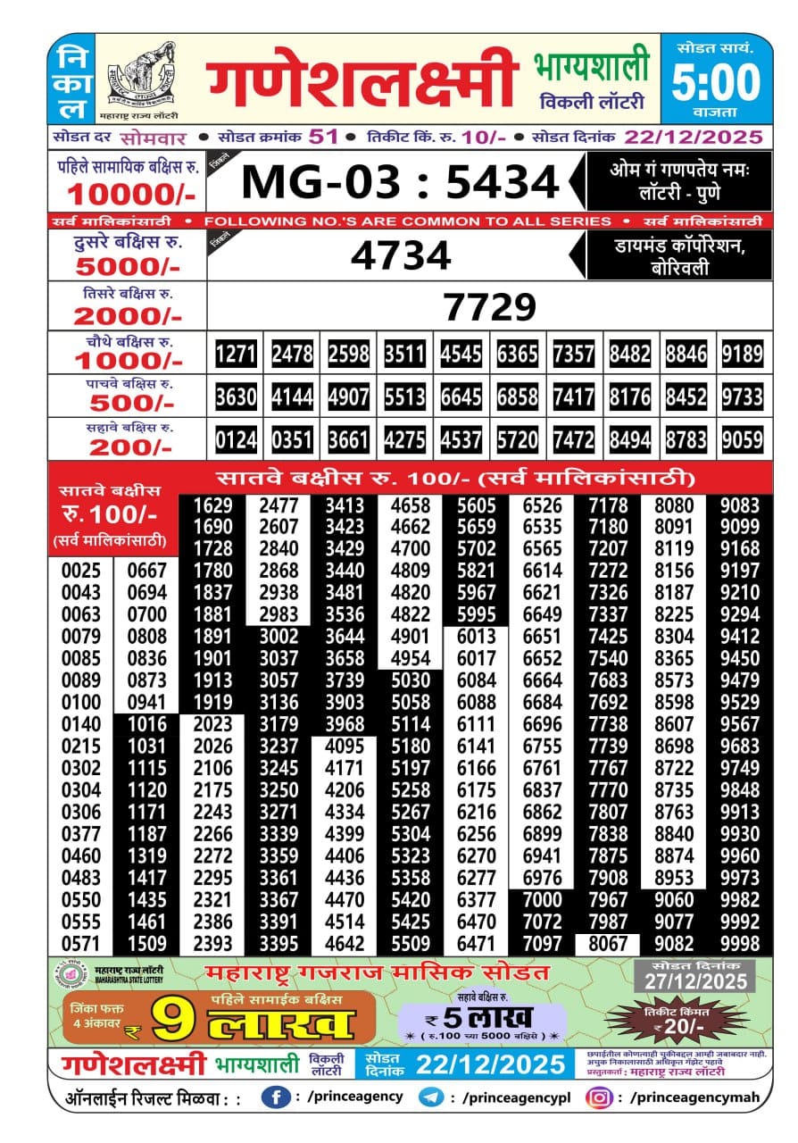 Maharashtra Ganeshlaxmi Bhagyashali Weekly Draw 22.12.2025 Result 5pm