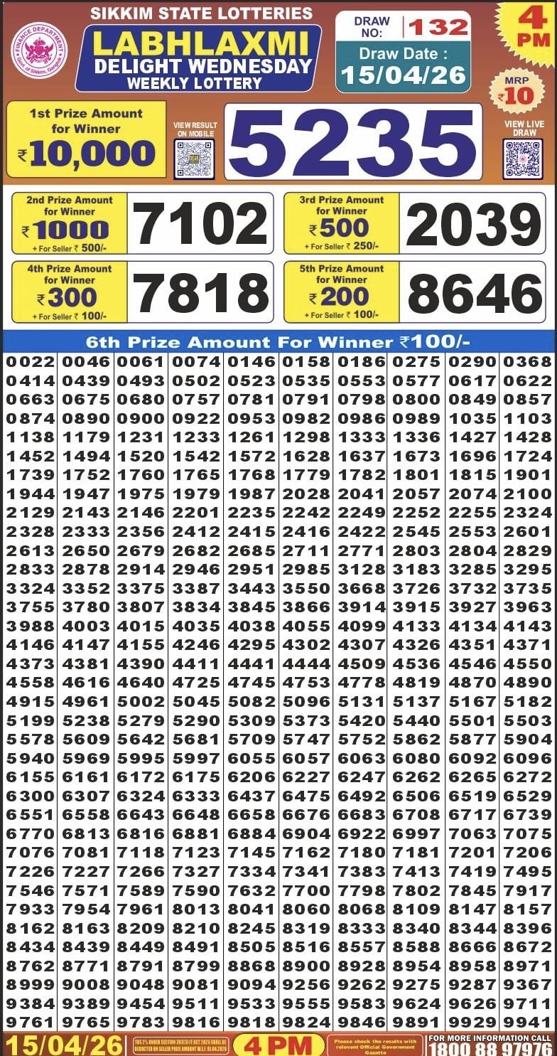 Sikkim State Labhlaxmi Delight Wednesday Weekly Lottery 15.04.2026 Result 4 PM
