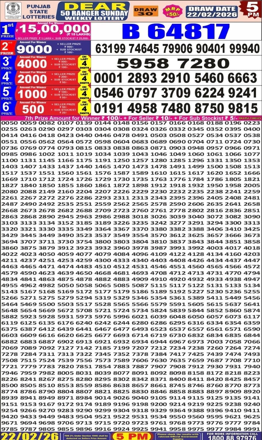Punjab State Dear 50 Ranger Sunday Weekly Lottery 22.2.2026 Result 5 PM