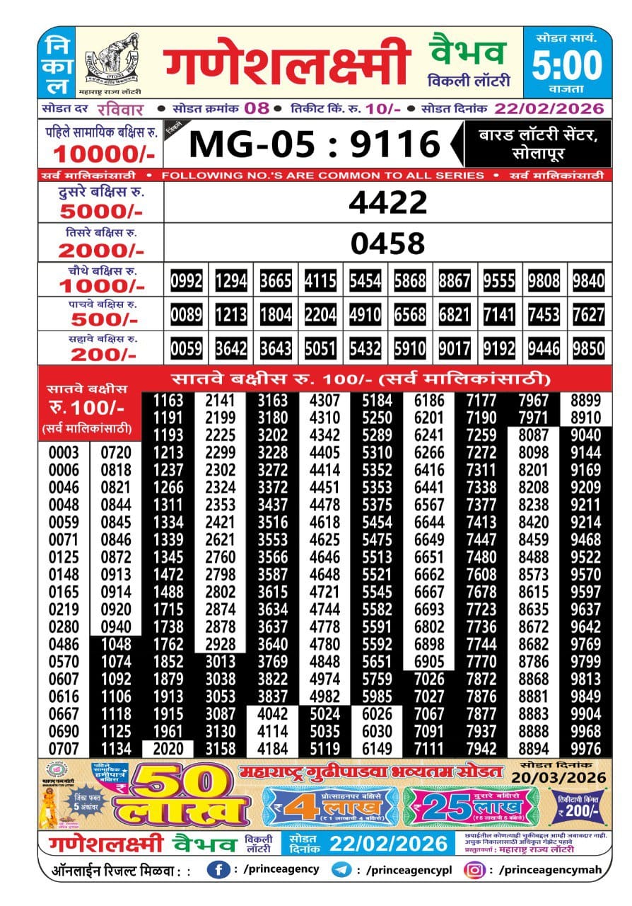 Maharashtra Ganeshlaxmi Vaibhav Weekly Draw 22.02.2026 Result 5 PM