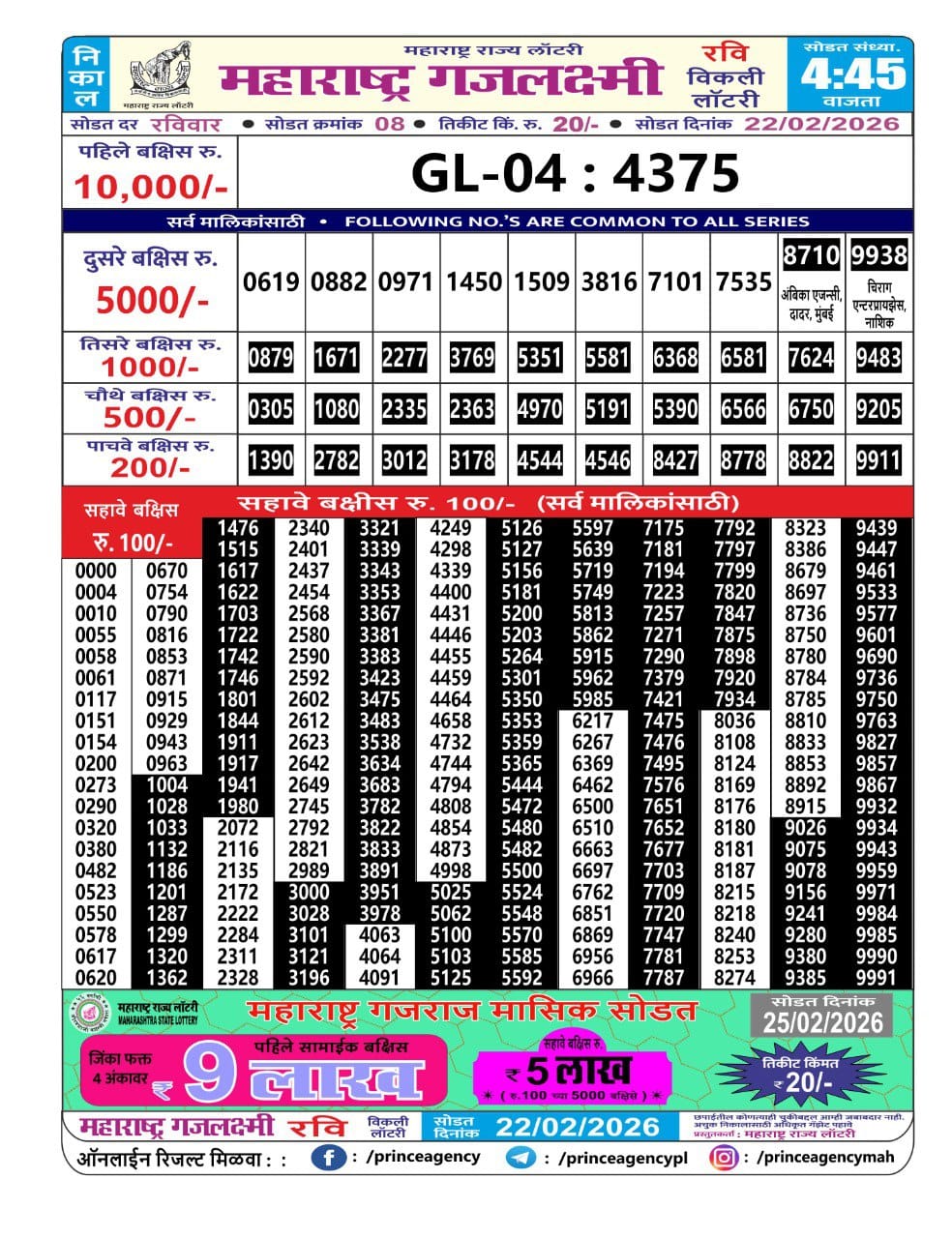 Maharashtra Gajlaxmi Ravi Weekly Draw 22.02.2026 Result 4.45 PM