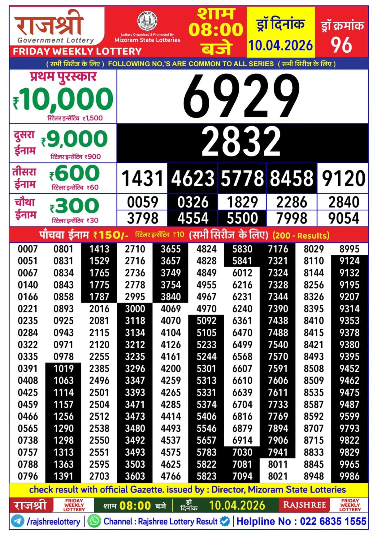 Rajshree Friday Weekly Lottery 10.04.2026 Result 8 PM