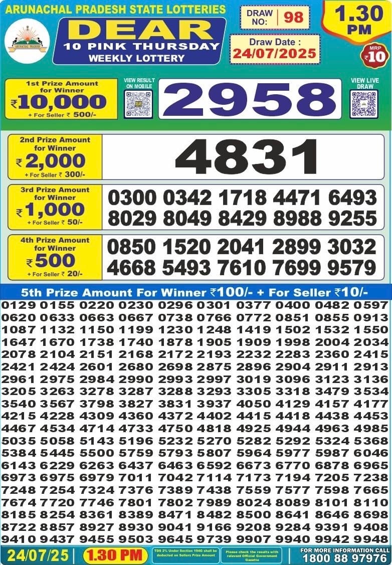 Dear 10 pink lottery 1.30PM Result 24.07.2025