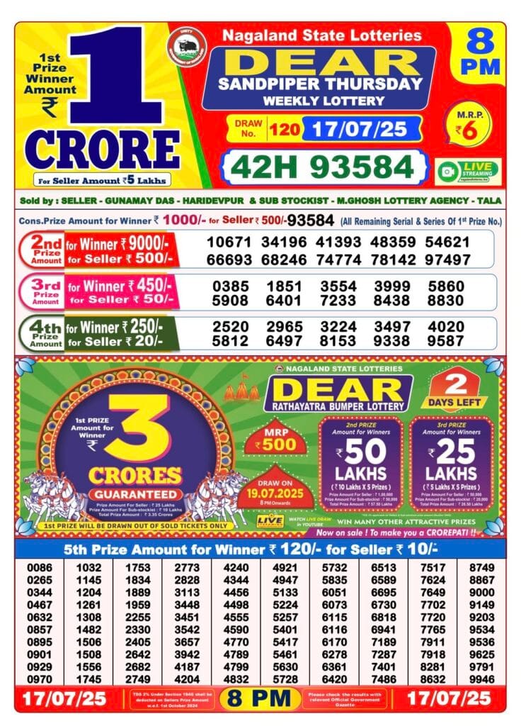 Dear Sandpiper Thursday Weekly Lottery 8PM Result 17.07.2025 0 Likes 63 Views Related Articles 1 71Nagaland State Dear Rathyatra Lottery 19 July 2025 Result 8 PM 0 52Rajshree Weekly Lottery 8PM Result 20.07.2025 0 43Maharashtra Sahyadri Prabhalaxmi Weekly Draw 22.11.2025 Result 4.45pm 1 91Golden 100 Gold Monthly Lottery Result 03.09.2025 At 6.30 PM