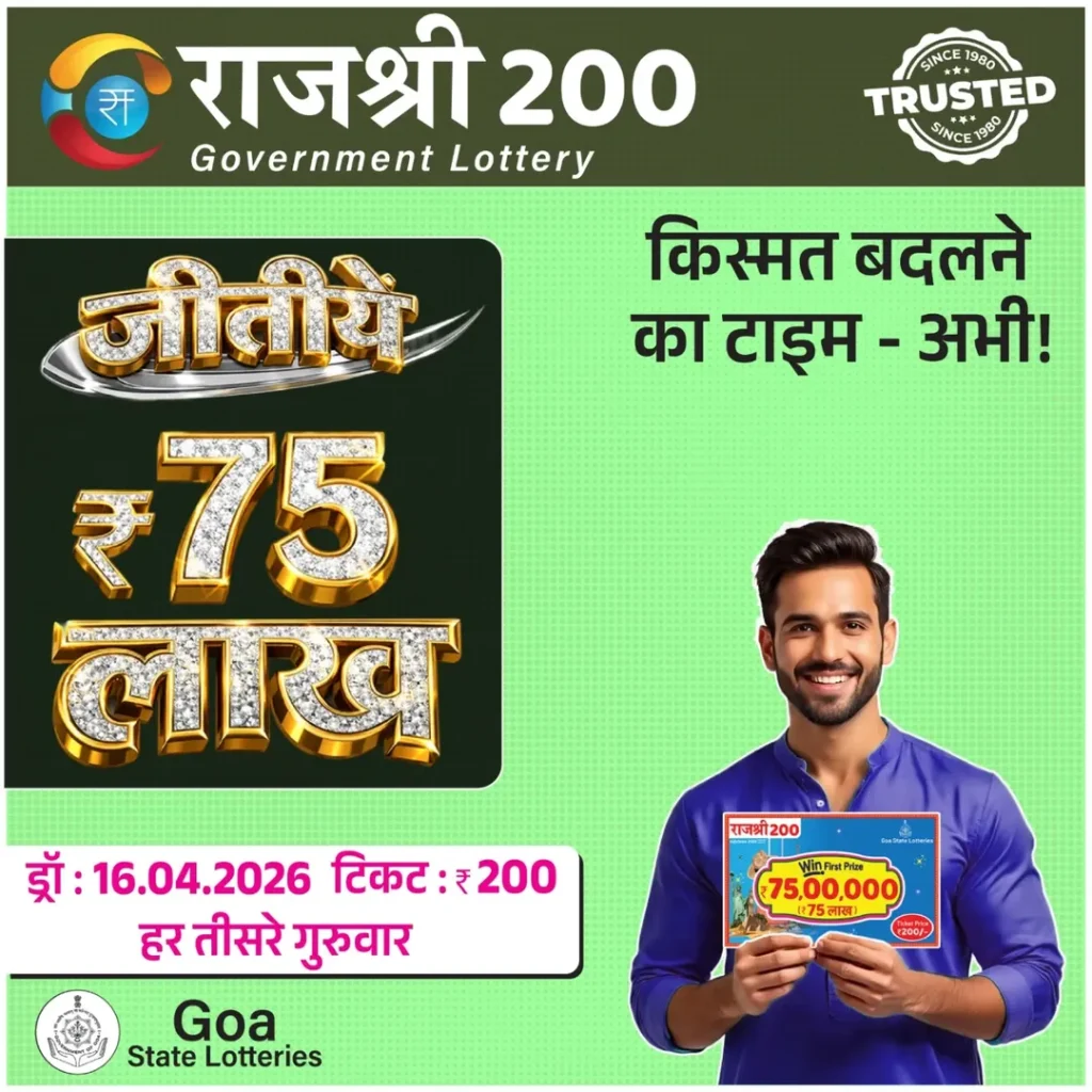 Goa State Rajshree 200 Monthly Lottery 51st Draw On Thursday, 16 April 2026 At 6.30 PM. You can watch result on our website lotteryresultsnow.in