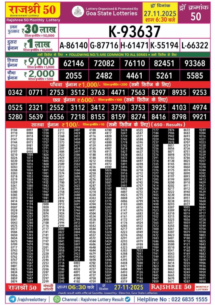 Goa State Rajshree 50 Monthly Lottery 27.11.2025 Result 6.30 PM 2 Likes 107 Views Related Articles 0 27Rajshree Night Som Weekly Lottery 16.02.2026 Result 9 PM 0 61Mizoram State Golden 250 gold monthly lottery 28.1.2026 at 6.30 PM 0 78Maharashtra Gajlaxmi Budh Weekly Draw 31.12.2025 Result 4.45pm 0 82Maharashtra Sahyadri (Monthly) Draw Result 10.02.2026