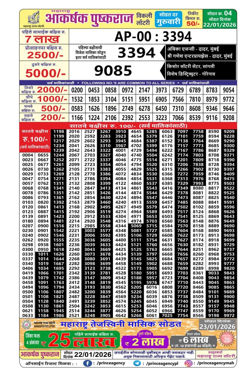 Golden 100 Gold Monthly Lottery 07.01.2026 Result 6.30 PM 0 Likes 66 Views Related Articles 0 73Rajshree 100 Monthly Lottery 04.12.2025 Result 6.30pm 0 152Maharashtra Akarshak Pushkaraj Weekly Draw Result 22.01.2026 0 59Golden Star Guru Weekly Lottery 29.01.2026 Result 9pm 1 98Dear mahanadi Thursday Weekly 1pm result 24.07.2025