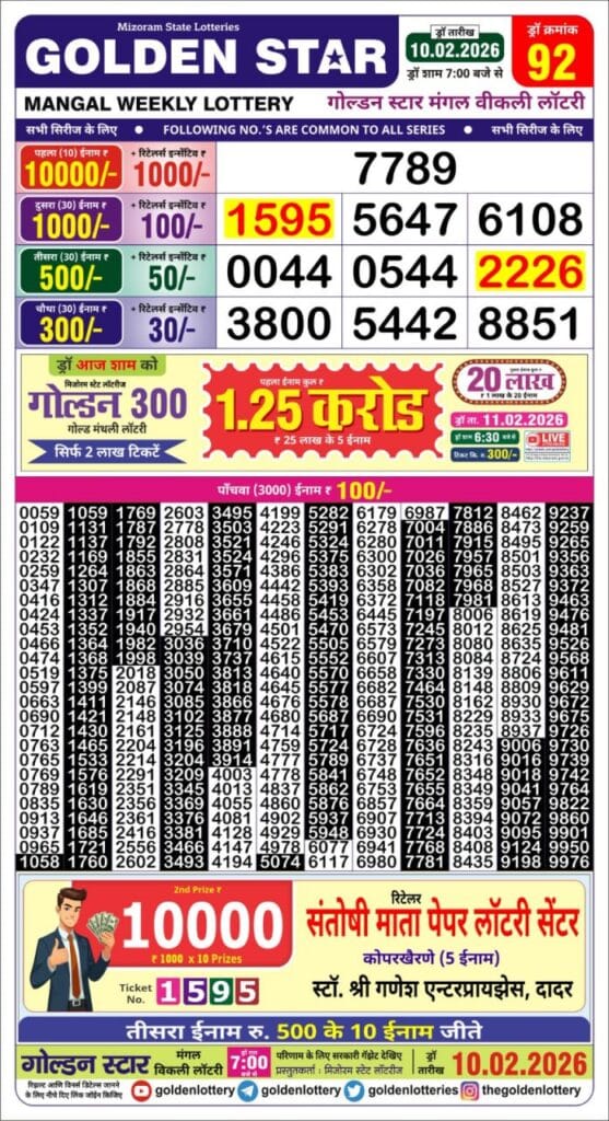 Golden Star Mangal Weekly Lottery 10.02.2026 Result 7 PM 0 Likes 77 Views Related Articles 0 62Maharashtra Gajlaxmi Som Weekly Draw 02.03.2026 Result 4.45 PM 0 58Rajshree Monday Weekly Lottery 02.03.2026 Result 8 PM 0 83Rajshree 200 Monthly Lottery 15.1.2026 Result 6.30 PM 0 30Sikkim State Labhlaxmi Delight Wednesday Weekly Lottery 25.03.2026 Result 4 PM