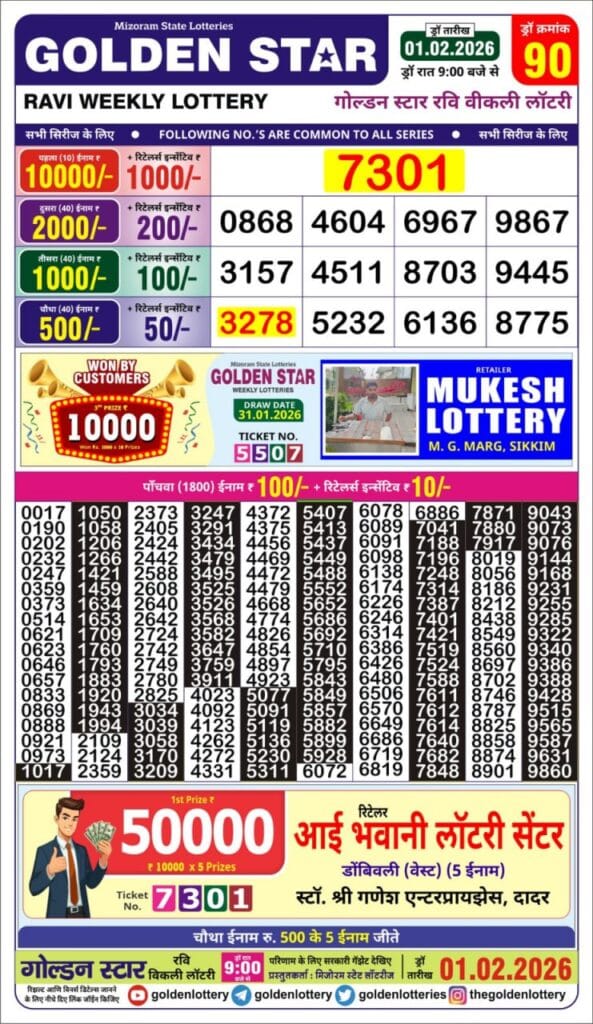 Golden Star Ravi Weekly Lottery 01.02.2026 Result 9pm 0 Likes 46 Views Related Articles 0 120Maharashtra Padmini Weekly Draw Result 22.07.2025 0 83Rajshree 200 Monthly Lottery 19 Febraury 2026 At 6.30 PM 0 52Rajshree 10 Evening Saturday Weekly Lottery 14.02.2026 Result 5.40 PM 0 61Maharashtra Ganeshlaxmi Shubh Weekly Draw 20.01.2026 Result 5pm