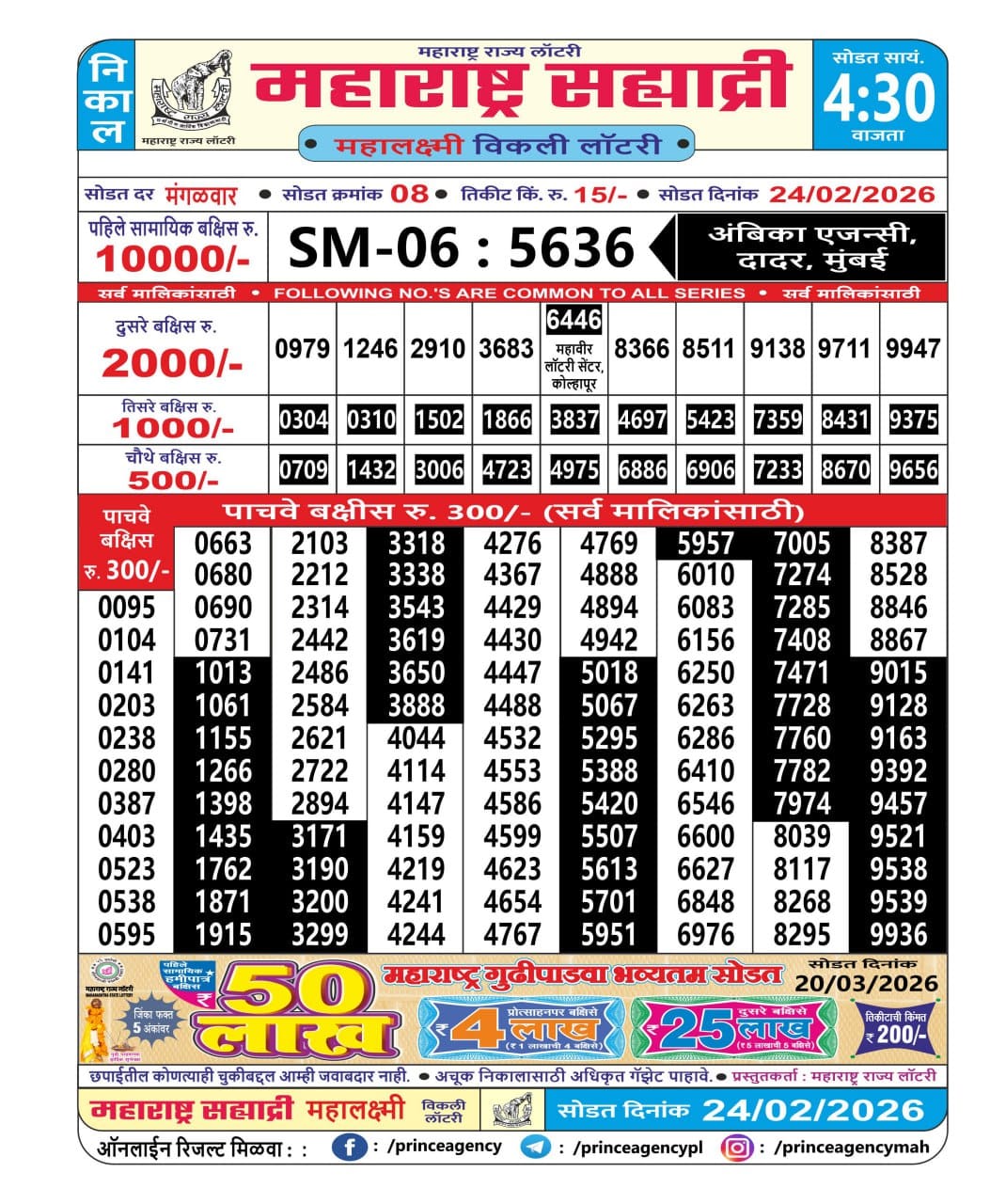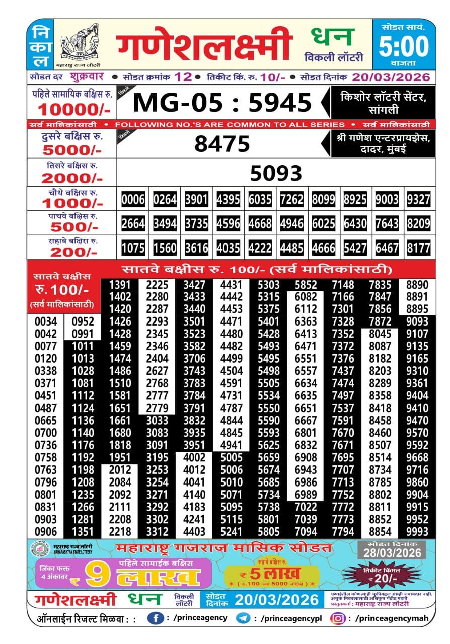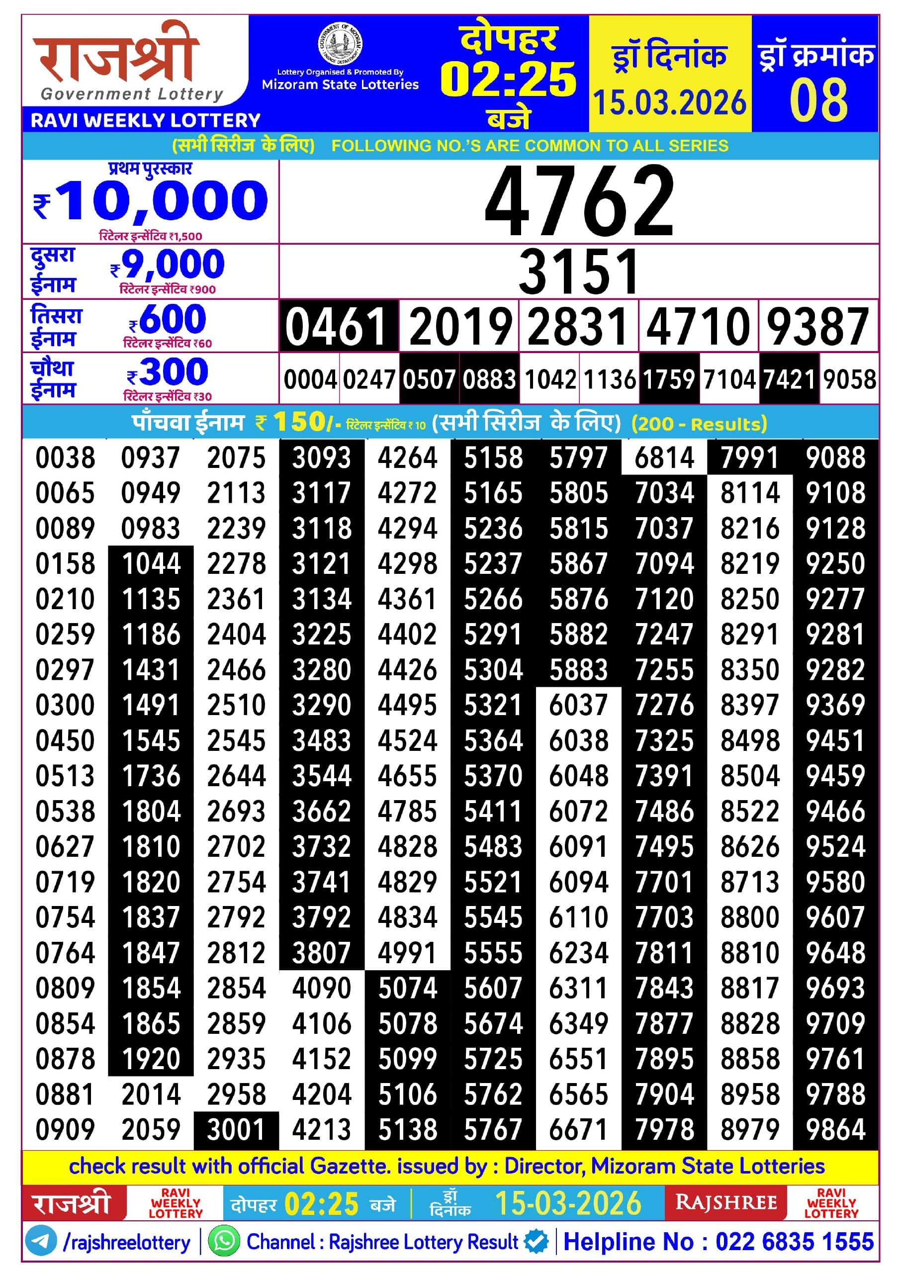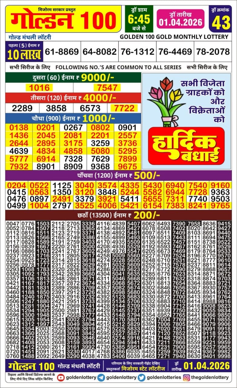 Golden Star Ravi Weekly Lottery 29.03.2026 Result 7 PM 0 Likes 40 Views Related Articles 0 44Rajshree Ravi Weekly Lottery 15.03.2026 Result 2.25 PM 0 25Maharashtra Gajlaxmi Mangal Weekly Draw 24.03.2026 Result 4.45 PM 0 50Rajshree 10 Evening Ravi Weekly Lottery 22.2.2026 Result 5.40 PM 0 98Golden 100 Gold Monthly Lottery 01.04.2026 Result 6.45 PM