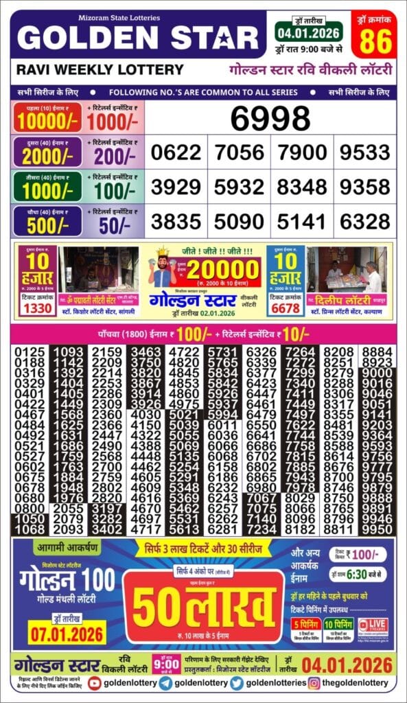 Golden Star Ravi Weekly Lottery 4.1.2026 Result 9 PM 0 Likes 122 Views Related Articles 0 18Maharashtra Sahyadri Prabhalaxmi Weekly Draw 04.04.2026 Result 4.30 PM 0 56Golden Star Shani Weekly Lottery 14.02.2026 Result 7 PM 0 133Punjab state dear 100 monthly lottery 7pm result 11.11.2025 0 56Maharashtra Sahyadri Mahalaxmi Weekly Draw 20.01.2026 Result 4.30pm