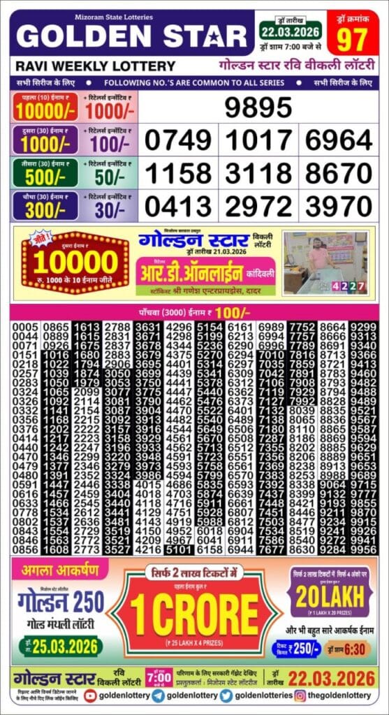 Golden Star Ravi Weekly Lottery Result 22.03.2026 Result 7 PM 0 Likes 51 Views Related Articles 0 65Rajshree 50 Budh Weekly Lottery 04.03.2026 Result 7.30 PM 0 103Punjab state dear 200 monthly lottery 7.3.2026 at 6pm (Happy Holi) 0 76Nagaland State Dear 2000 Monthly Lottery 8 November 2025 At 7 PM 0 89Maharashtra Ganeshlaxmi Bhagyashali Weekly Draw 17.11.2025 Result 5pm