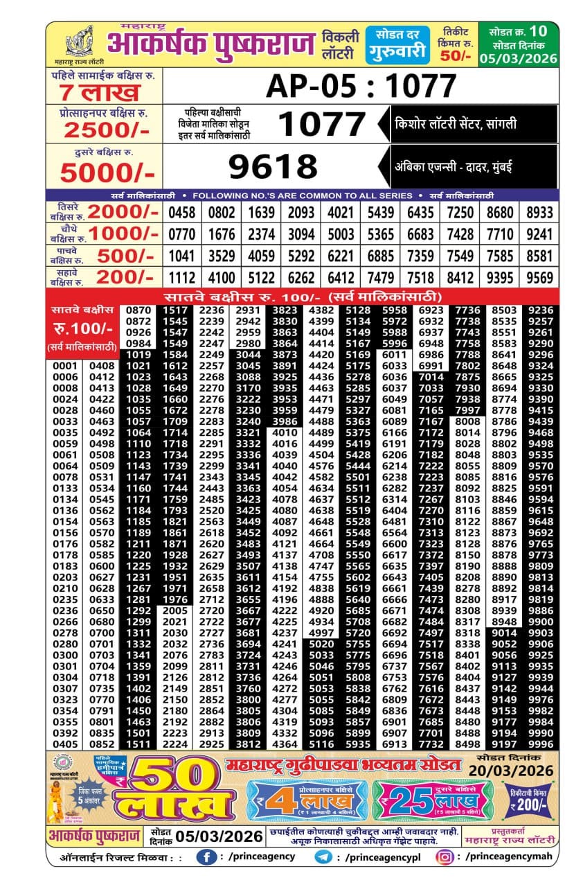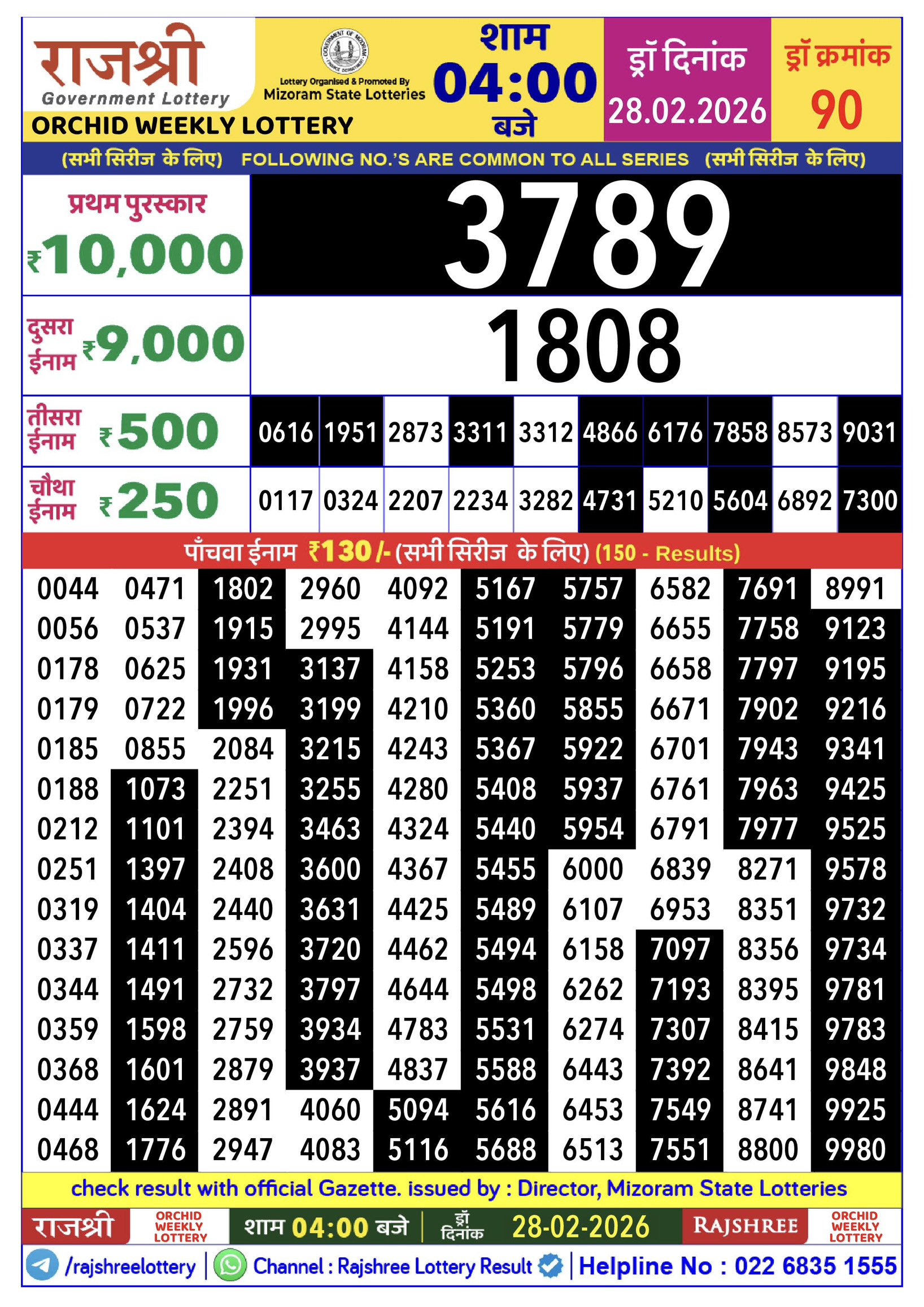 Golden Star Shani Weekly Lottery 21.03.2026 Result 7 PM 0 Likes 57 Views Related Articles 0 62Maharashtra Ganeshlaxmi Gaurav Weekly Draw 26.03.2026 Result 5 PM 0 121Maharashtralaxmi Weekly Draw Result 29.11.2025 0 88Maharashtra Gajlaxmi Shani Weekly Draw 21.02.2026 Result 4.45 PM 0 29Rajshree Orchid Weekly Lottery 28.2.2026 Result 4 PM