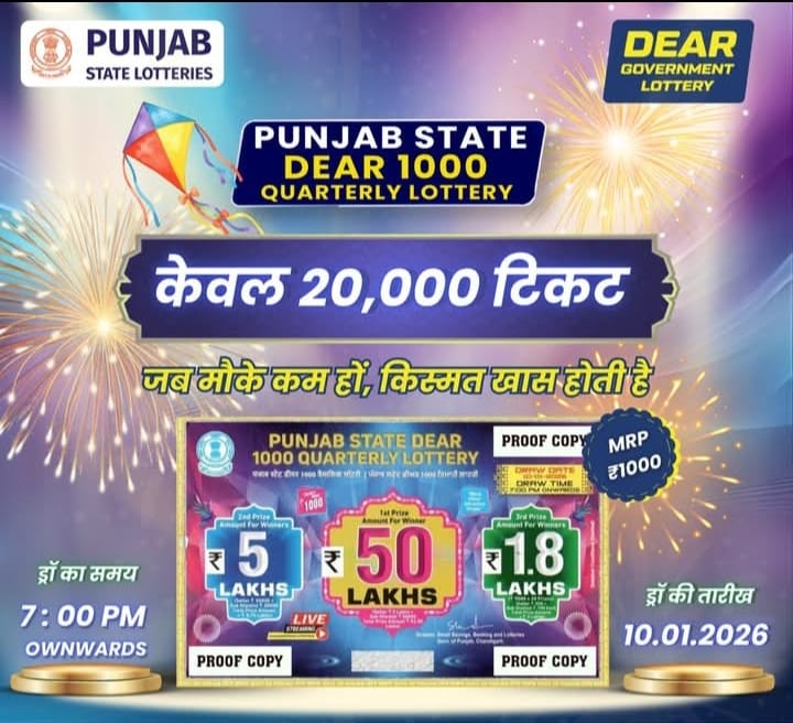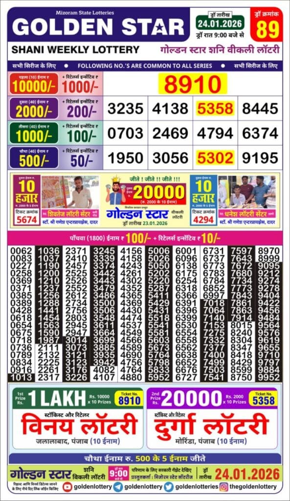 Golden Star Shani Weekly Lottery 24.01.2026 Result 9pm 0 Likes 57 Views Related Articles 0 91Punjab Rakhi Bumper Lottery 8PM Result 16.08.2025 1 154Maharashtra Vaibhavlaxmi Weekly Draw Result 31.10.2025 0 60Punjab State Dear 1000 Quarterly Lottery 10 January 2026 At 7 PM 0 102Maharashtra Sahyadri Prabhalaxmi Weekly Draw 03.01.2026 Result 4.30 PM