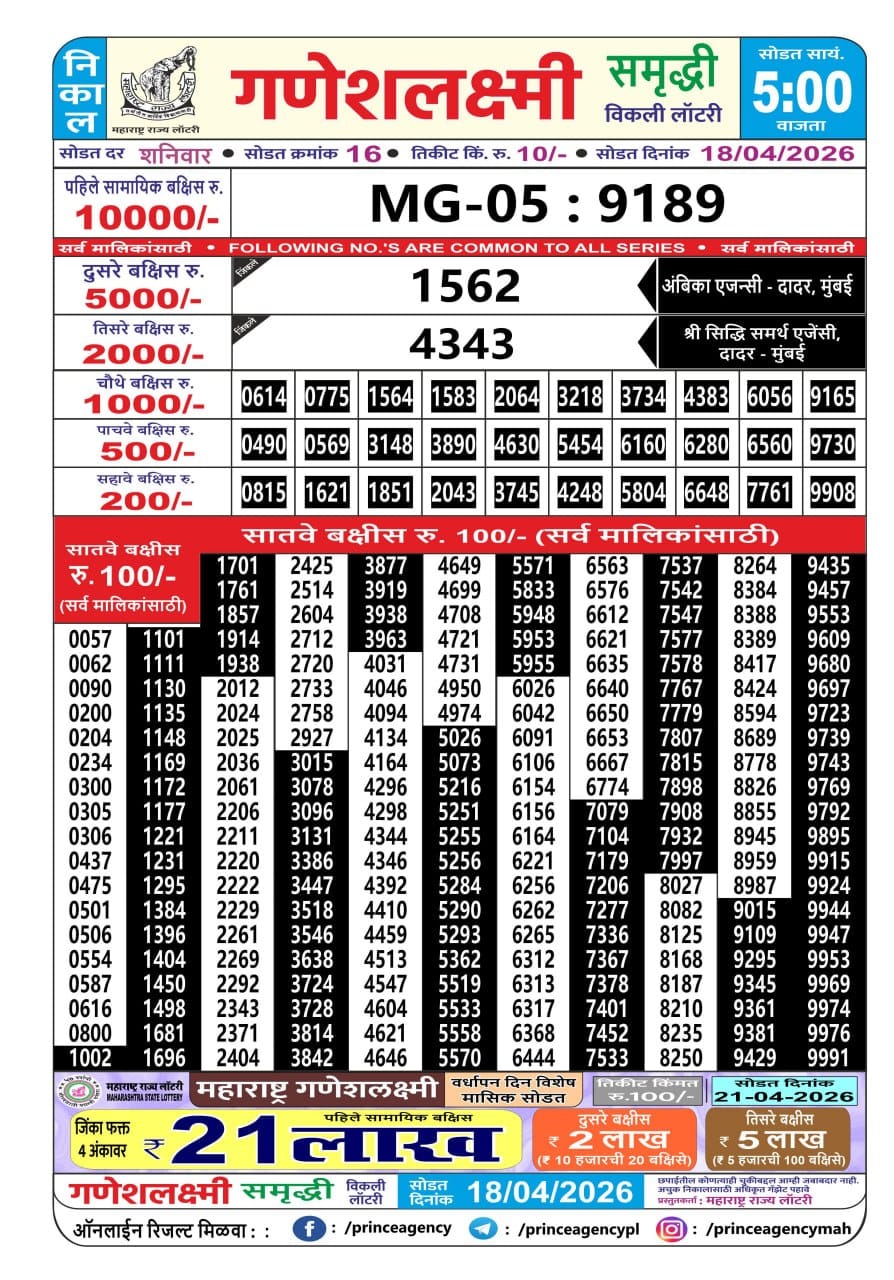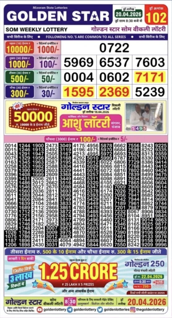 Golden Star Som Weekly Lottery 20.04.2026 Result 8.30 PM 0 Likes 5 Views Related Articles 0 95Maharashtra Sahyadri Prabhalaxmi Weekly Draw 15.11.2025 Result 4.30pm 1 62Rajshree Night Som Weekly Lottery 02.03.2026 Result 9 PM 0 38Rajshree Ravi Weekly Lottery 05.04.2026 Result 2.25 PM 0 111Maharashtra Ganeshlaxmi Dhan Weekly Draw 23.01.2026 Result 5pm