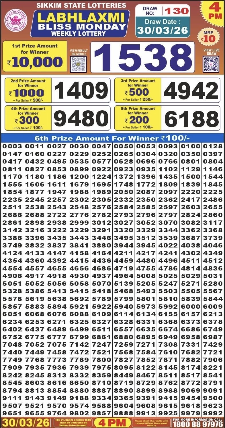 Labh Laxmi Delight weekly Lottery 4PM Result 23.07.2025 0 Likes 108 Views Related Articles 0 60Sikkim State Labhlaxmi Glad Thursday Weekly Lottery 5.2.2026 Result 4 PM 0 32Sikkim State Labhlaxmi Bliss Monday Weekly Lottery 30.03.3026 Result 4 PM 0 133Punjab state dear 100 monthly lottery 7pm result 11.11.2025 0 73Rajshree 50 Mangal Weekly Lottery 17.03.2026 Result 7.30 PM