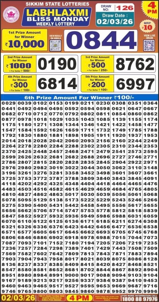 Labhlaxmi Bliss Monday Weekly Lottery 02.03.2026 Result 4 PM 0 Likes 36 Views Related Articles 0 20Golden Star Shukra Weekly Lottery 03.04.2026 Result 8.30 PM 0 52Rajshree Night Som Weekly Lottery 23.2.2026 Result 9 PM 0 53Punjab State Dear 50 Buster Wednesday Weekly Lottery 18.2.2026 Result 5 PM 0 162Maharashtra Akarshak Pushkaraj Weekly Draw Result 05.03.2026