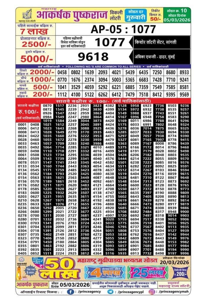 Maharashtra Akarshak Pushkaraj Weekly Draw Result 05.03.2026 0 Likes 162 Views Related Articles 0 85Rajshree 50 Monthly Lottery 26.2.2026 Result 6.30 PM 0 68Rajshree 50 Mangal Weekly Lottery 17.03.2026 Result 7.30 PM 0 81Maharashtra Sagarlaxmi Weekly Draw Result 02.03.2026 0 75Maharashtra Gajlaxmi Budh Weekly Draw 4.2.2026 Result 4.45pm