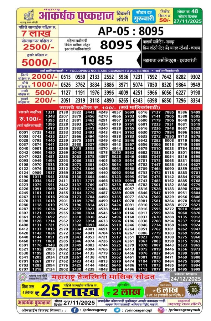 Maharashtra Akarshak Pushkaraj Weekly Draw Result 27.11.2025 0 Likes 118 Views Related Articles 0 57Maharashtra Ganeshlaxmi Vijayee Weekly Draw 05.11.2025 Result 5pm 0 73Maharashtra Padmini Weekly Draw Result 11.11.2025 0 77Rajshree 200 monthly lottery 6.30pm result 21.08.2025 0 47Maharashtra Gajlaxmi Ravi Weekly Draw 02.11.2025 Result 4.45pm