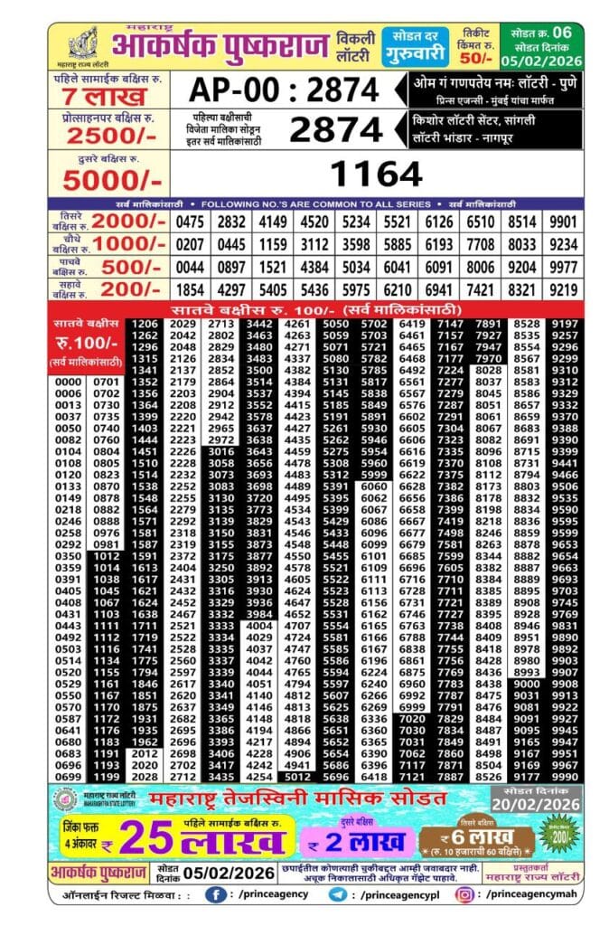Maharashtra Akarshak Pushkaraj Weekly Draw Result 5.2.2026 0 Likes 74 Views Related Articles 0 82Golden 1000 New Year Dhamaka Lottery 31.12.2025 At 6.15 PM 0 59Maharashtra Akshay Weekly Draw Result 4.2.2026 0 112Goa State Rajshree 250 Monthly Lottery 2 December 2025 At 6.30 PM 0 24Rajshree Sunday Weekly Lottery 15.2.2026 Result 8 PM