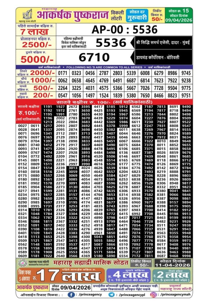 Maharashtra Akarshak Pushkraj Weekly Draw Result 09.04.2026 0 Likes 22 Views Related Articles 0 91Maharashtra Gajlaxmi Som Weekly Draw 21.07.2025 Result 4.45pm 0 117Maharashtra Ganeshlaxmi Dhan Weekly Draw 06.02.2026 Result 5pm 0 111Maharashtra Sahyadri Rajlaxmi Weekly Draw 16.01.2026 Result 4.30pm 0 76Punjab State Dear 50 Beast Monday 6pm Lottery Result 19.01.2026