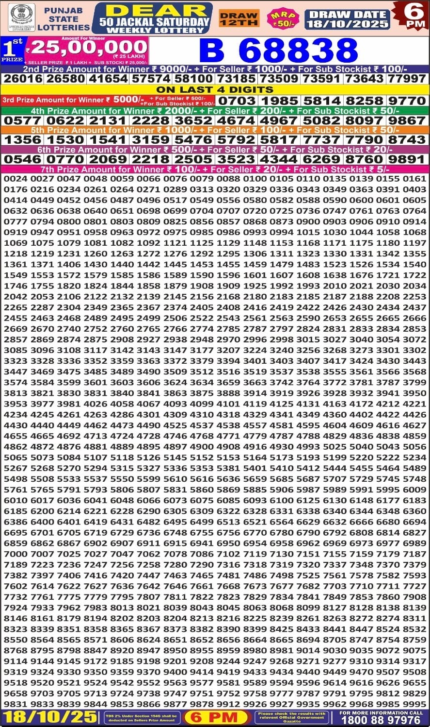Maharashtra Gajlaxmi Budh Weekly Draw 10.12.2025 Result 4.45pm 0 Likes 49 Views Related Articles 0 41Punjab State Dear 50 Jackal Saturday 6pm Lottery Result 18.10.2025 0 40Punjab State Dear 50 Colt Friday 6pm Lottery Result 17.10.2025 0 68Punjab State Dear 50 Bronco Tuesday 6pm Lottery Result 16.09.2025 0 35Maharashtra Mohini Weekly Draw 07.12.2025 Result 4.30pm