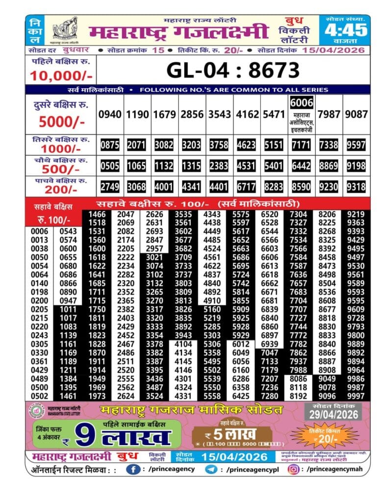 Maharashtra Gajlaxmi Budh Weekly Draw 15.04.2026 Result 4.45 PM 0 Likes 18 Views Related Articles 0 55Punjab State Dear 50 Bronco Tuesday Weekly Lottery 17.02.2026 Result 5 PM 0 62Rajshree Lily Weekly Lottery 25.2.2026 Result 4 PM 0 39Rajshree Night Ravi Weekly Lottery 05.04.2026 Result 9 PM 0 88Maharashtra Sagarlaxmi Weekly Draw Result 02.03.2026