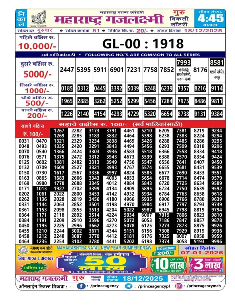 Maharashtra Gajlaxmi Guru Weekly Draw 18.12.2025 Result 4.45pm 0 Likes 35 Views Related Articles 1 55Punjab State Dear 50 Bronco Tuesday 6pm Lottery Result 09.12.2025 0 51Maharashtra Mohini Weekly Draw 26.10.2025 Result 4.30pm 0 51Punjab State Dear 50 Bronco Tuesday 6PM Result 18.11.2025 1 91Goa State Rajshree 250 Monthly Lottery 5.8.2025 At 6.30 PM