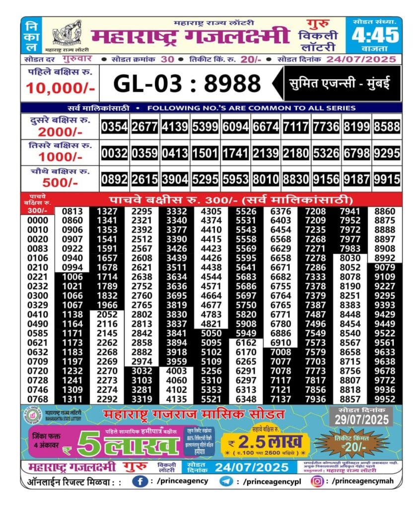 Maharashtra Gajlaxmi Guru Weekly Draw 24.07.2025 Result 4.45pm 0 Likes 73 Views Related Articles 0 56Dear super mercury 7pm result 20.07.2025 0 68Maharashtra Laxmi Weekly Draw Result 25.10.2025 0 62Golden Star Weekly Lottery result 19 July 2025 0 5Maharashtra Sahyadri Vijayalaxmi Weekly Draw 24.12.2025 Result 4.30pm