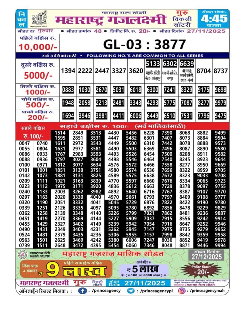 Maharashtra Gajlaxmi Guru Weekly Draw 27.11.2025 Result 4.45pm 0 Likes 63 Views Related Articles 1 92Punjab state dear 200 monthly lottery 4 October 2025 At 8 PM 0 57Maharashtra Padmini Weekly Draw Result 18.11.2025 0 76Maharashtra Ganeshlaxmi Diwali (Monthly) Draw Result 14.11.2025 0 28Maharashtra Ganeshlaxmi Shubh Weekly Draw 16.12.2025 Result 4.45pm